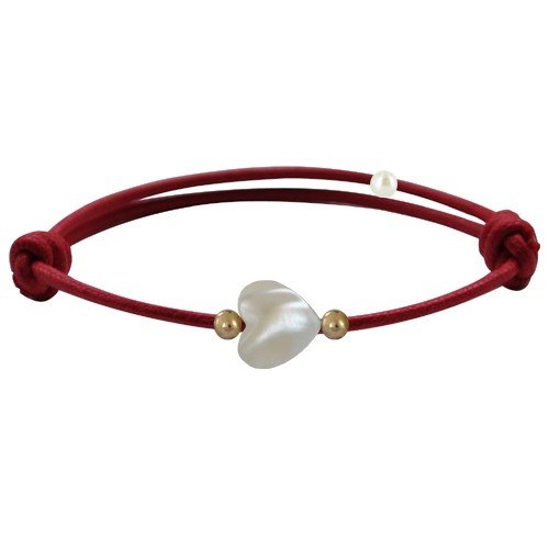 Bijoux Les Poulettes - Bracelet Petit Coeur de Nacre et Perle Plaqué Or - Lien Rouge