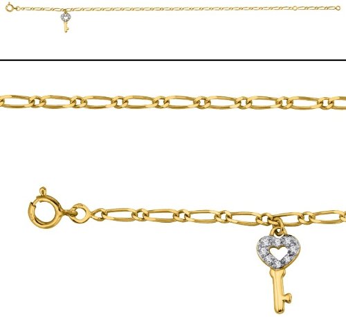Chaine de cheville en plaqué or jaune maille alternée 1+1 ( figaro 1 ) avec une pampille motif clé avec des oxydes de zirconium. Longueur 24 cm.